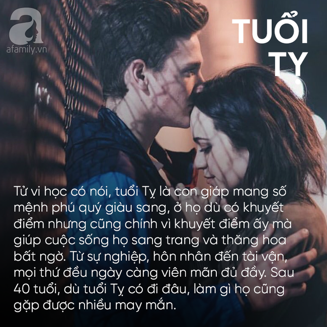 Khác với tuổi Sửu và tuổi Mão, trời sinh tuổi Tỵ có tính cách độc lập và sâu sắc. Họ vốn rất thông minh và tài giỏi, có khả năng tự tạo dựng sự nghiệp, tự làm chủ cuộc sống của chính mình. Tuy nhiên, tuổi Tỵ yêu ghét khá rõ ràng, một khi họ đã không thích thì không cách nào có thể cữu vãn được. Trong cuộc sống tuổi Tỵ dường như khá cô đơn, vì tính cách của họ nên không phải ai cũng dễ dàng kết bạn, nhưng một khi ai đã trở thành tri kỷ thì có thể sống chết cùng nhau. Tử vi học có nói, tuổi Tỵ là con giáp mang số mệnh phú quý giàu sang, ở họ dù có khuyết điểm nhưng cũng chính vì khuyết điểm ấy mà giúp cuộc sống họ sang trang và thăng hoa bất ngờ. Từ sự nghiệp, hôn nhân đến tài vận, mọi thứ đều ngày càng viên mãn đủ đầy. Sau 40 tuổi, dù tuổi Tỵ có đi đâu, làm gì họ cũng gặp được nhiều may mắn. Hơn nữa họ còn có quý nhân phù trợ, càng lớn tuổi càng giàu có, hậu vận an nhàn hưởng phước hết đời.
