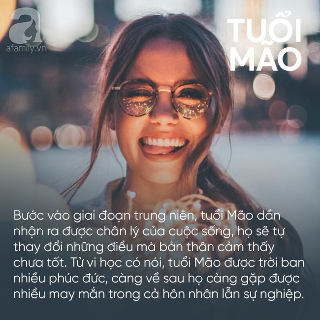 Trời sinh tuổi Mão vốn là những người sống tình cảm, chan hòa và biết suy nghĩ đến mọi người. Tuy nhiên, tùy thuộc vào hoàn cảnh sống mà có những người không thể thể hiện điều đó cho những người xung quanh thấy. Họ hay tỏ ra bất cần, sống khép kín và không thích quan tâm đến những chuyện xung quanh. Nhưng trên thực tế, những ai khiến tuổi Mão để tâm thì họ sẽ luôn lo lắng không ngừng. Bước vào giai đoạn trung niên, tuổi Mão dần nhận ra được chân lý của cuộc sống, họ sẽ tự thay đổi những điều mà bản thân cảm thấy chưa tốt. Tử vi học có nói, tuổi Mão được trời ban nhiều phúc đức, càng về sau họ càng gặp được nhiều may mắn trong cả hôn nhân lẫn sự nghiệp. Đặc biệt, từ sau 40 tuổi, tuổi Mão có thể kiếm tiền dễ dàng, con đường dẫn đến cuộc sống giàu có được trải đầy hoa hồng, chỉ cần biết nắm bắt thời cơ thì không có gì phải lo lắng.
