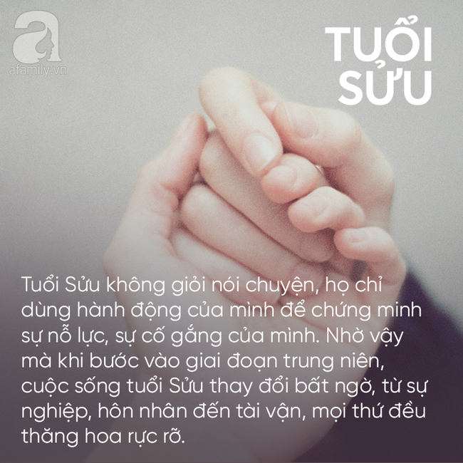 Trời sinh tuổi Sửu là những người siêng năng, chăm chỉ, bất kể ngày nắng hay mưa họ vẫn không ngừng lao động với mong muốn có khả năng xây dựng cuộc sống sung túc và viên mãn. Đa số tuổi Sửu là những người khá cứng đầu, một khi họ quyết tâm làm điều gì sẽ theo đến cùng dù có xảy ra chuyện gì. Tử vi học có nói, trời sinh tuổi Sửu có số mệnh phú quý, cuộc sống giàu có mà họ có được đều từ hai bàn tay trắng. Tuổi Sửu không giỏi nói chuyện, họ chỉ dùng hành động của mình để chứng minh sự nỗ lực, sự cố gắng của mình. Nhờ vậy mà khi bước vào giai đoạn trung niên, cuộc sống tuổi Sửu thay đổi bất ngờ, từ sự nghiệp, hôn nhân đến tài vận, mọi thứ đều thăng hoa rực rỡ. Cũng chính vì sự cứng đầu và kiên định của mình mà tuổi Sửu có thể gặt hái được thành công ngoài mong đợi, cuộc sống hậu vận giàu có viên mãn không ai sánh bằng.