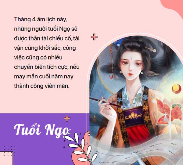 Tuổi Ngọ cũng là những người vui vẻ, ham chơi, và thường bị đánh đồng là những người không có tương lai, nhưng trên thực tế họ luôn có chí tiến thủ. Tháng 4 âm lịch này, những người tuổi Ngọ sẽ được thần tài chiếu cố, tài vận cũng khởi sắc, công việc cũng có nhiều chuyển biến tích cực, nếu may mắn cuối năm nay thành công viên mãn.