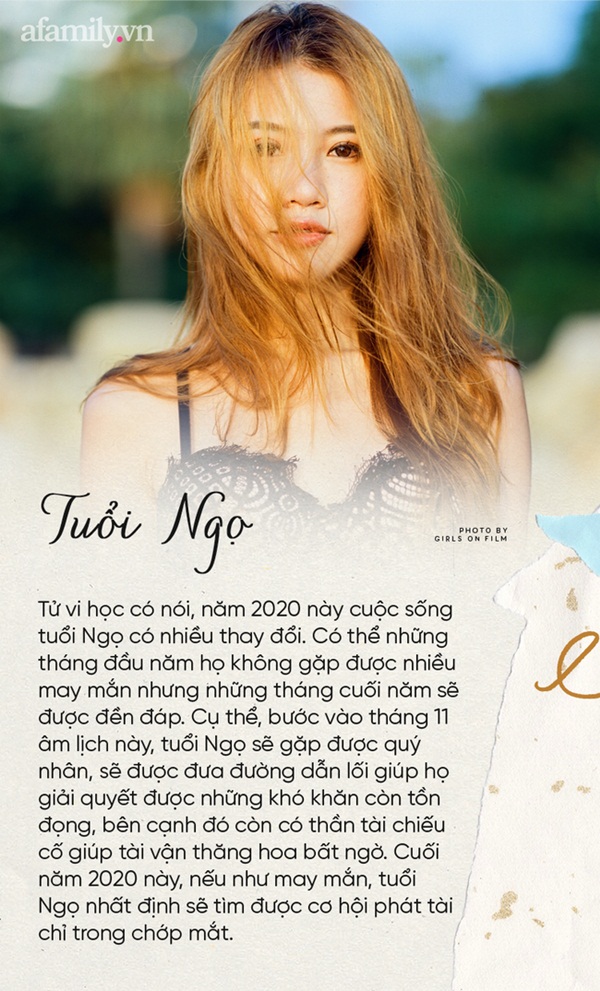 Tử vi học có nói, năm 2020 này cuộc sống tuổi Ngọ có nhiều thay đổi. Có thể những tháng đầu năm họ không gặp được nhiều may mắn nhưng những tháng cuối năm sẽ được đền đáp. Cụ thể, bước vào tháng 11 âm lịch này, tuổi Ngọ sẽ gặp được quý nhân, sẽ được đưa đường dẫn lối giúp họ giải quyết được những khó khăn còn tồn đọng, bên cạnh đó còn có thần tài chiếu cố giúp tài vận thăng hoa bất ngờ. Cuối năm 2020 này, nếu như may mắn, tuổi Ngọ nhất định sẽ tìm được cơ hội phát tài chỉ trong chớp mắt.