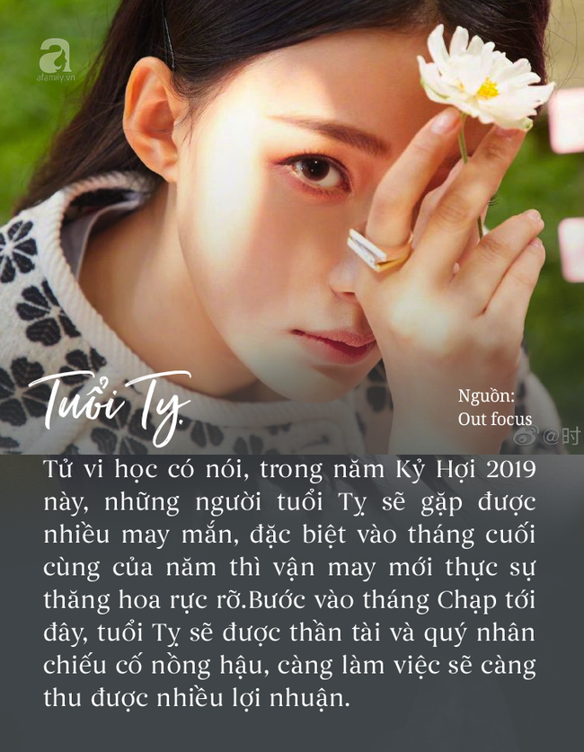 Tử vi học có nói, trong năm Kỷ Hợi 2019 này, những người tuổi Tỵ sẽ gặp được nhiều may mắn, đặc biệt vào tháng cuối cùng của năm thì vận may mới thực sự thăng hoa rực rỡ.Bước vào tháng Chạp tới đây, tuổi Tỵ sẽ được thần tài và quý nhân chiếu cố nồng hậu, càng làm việc sẽ càng thu được nhiều lợi nhuận. Trước khi bước Tết Canh Tý 2020, tuổi Tỵ sẽ tìm được hướng đi mới trong công việc và cuộc sống tương lai.