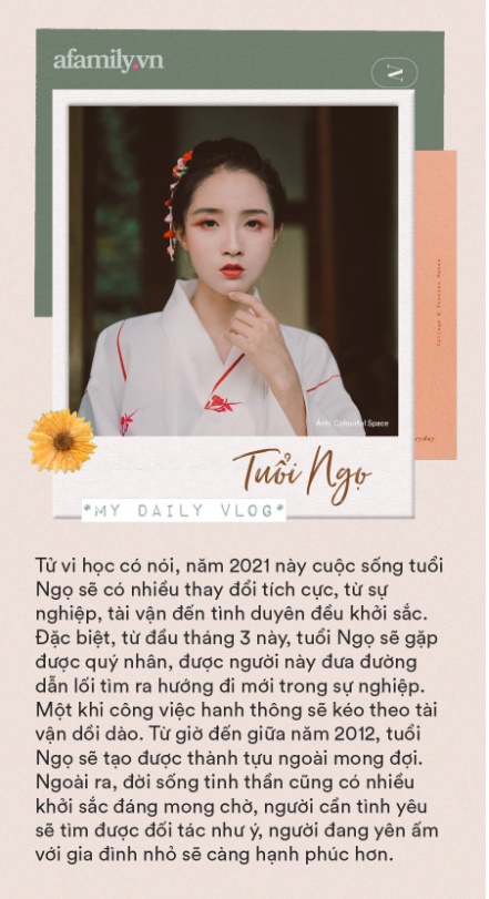 Tử vi học có nói, năm 2021 này cuộc sống tuổi Ngọ sẽ có nhiều thay đổi tích cực, từ sự nghiệp, tài vận đến tình duyên đều khởi sắc. Đặc biệt, từ đầu tháng 3 này, tuổi Ngọ sẽ gặp được quý nhân, được người này đưa đường dẫn lối tìm ra hướng đi mới trong sự nghiệp. Một khi công việc hanh thông sẽ kéo theo tài vận dồi dào. Từ giờ đến giữa năm 2012, tuổi Ngọ sẽ tạo được thành tựu ngoài mong đợi. Ngoài ra, đời sống tinh thần cũng có nhiều khởi sắc đáng mong chờ, người cần tình yêu sẽ tìm được đối tác như ý, người đang yên ấm với gia đình nhỏ sẽ càng hạnh phúc hơn.