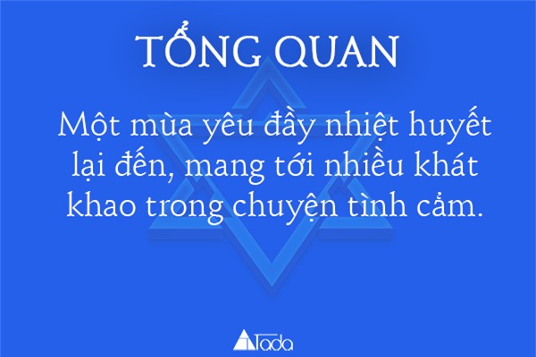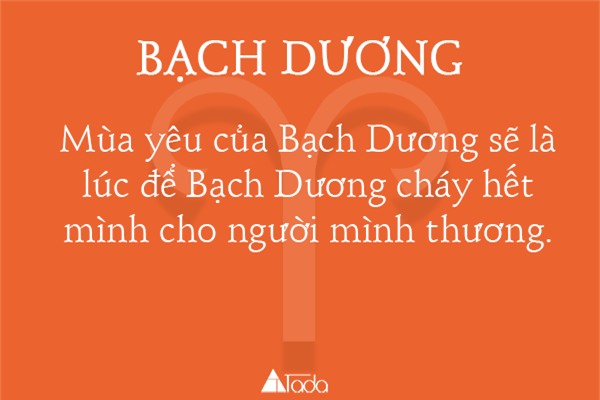 Một mùa yêu đầy nhiệt huyết của Lửa nữa lại đến, mang tới cho các cung hoàng đạo những lãng mạn và nhiều khát khao cháy bỏng hơn trong chuyện tình cảm của mình. Cùng mạnh dạn bày tỏ những điều thầm kín trong mình với đối phương trong thời gian đầy thuận lợi này nhé!