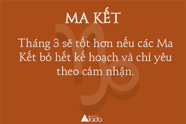 Trong khi các cung hoàng đạo đều đang khá háo hức với chuyện tình cảm, Ma Kết dường như lại chẳng thể tìm nổi cảm hứng cho chính mình. Mọi dự định đều gặp khá nhiều cản trở, không được như ý. Vậy nên, các bạn Ma Kết thân mến, đôi khi, cứ kệ hết mọi kế hoạch và sống theo cảm giác của mình có thể sẽ khiến mọi chuyện thú vị hơn nhiều đó!