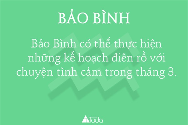 Không quá hứng khởi với chuyện yêu đương trong tháng 3. Tuy nhiên, nếu đang có trong đầu một vài ý định điên rồ để có thể cùng người mình yêu thực hiện, các Bảo Bình cũng có thể xúc tiến triển khai trong tháng 3 đầy lãng mạn này nhé!