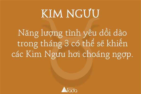 Năng lượng tình yêu dồi dào trong tháng 3 có thể sẽ khiến các Kim Ngưu hơi choáng ngợp thời gian đầu. Tuy nhiên, tháng 3 sẽ là thời cơ thích hợp nhất để tỏ tình trong năm nay, nên các Kim Ngưu đừng bỏ lỡ nhé.