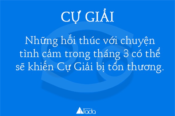 Những hối thúc với chuyện tình cảm trong tháng 3 có thể sẽ rất dễ khiến các Cự Giải bị tổn thương. Cảm giác luôn gặp cản trở, khó khăn và luôn e ngại khi tiến thêm bất cứ bước nào trong chuyện tình cảm sẽ luôn vây lấy Cự Giải. Hãy cứ hít thật sâu và thở ra nhẹ nhàng nhé. Mọi chuyện rồi sẽ ổn thôi.