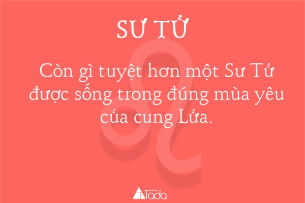 Còn gì tuyệt hơn một Sư Tử được sống trong đúng mùa yêu của cung Lửa. Đã đến lúc thực hiện mọi kế hoạch lãng mạn của mình rồi. Còn chần chừ gì nữa các Sư Tử? Tỏ tình thôi! Chúc các bạn may mắn và sớm được ở cạnh một nửa của mình lâu thật lâu.