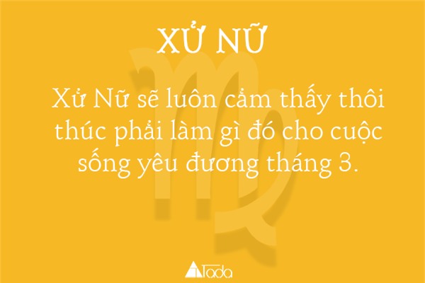Không phải lúc nào cũng hứng thú với chuyện tình cảm, nhưng trong tháng 3, các Xử Nữ sẽ luôn cảm thấy thôi thúc phải làm gì đó cho cuộc sống yêu đương của mình. Và chắc chắn, các bạn cũng sẽ đủ khôn khéo để đạt được những gì mình muốn, phải không nào?