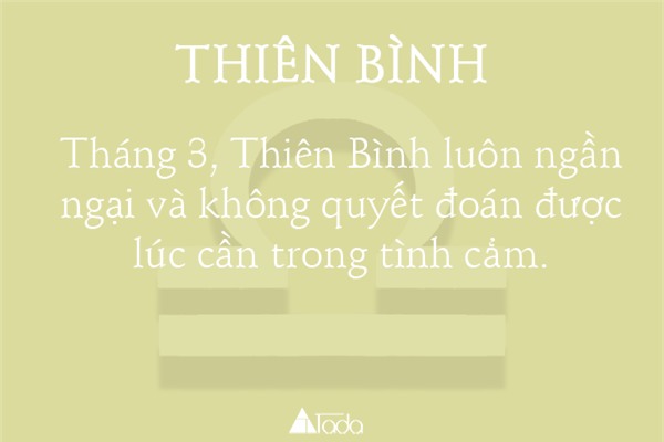 Luôn trong tâm trạng yêu và muốn yêu vào tháng này, nhưng dường như Thiên Bình lại luôn cảm thấy ngần ngại và thực sự không hề quyết đoán được lúc cần. Đừng để những băn khoăn làm chùn bước bạn nhé. Bởi khi bạn mải băn khoăn, người ta đã chuyển sự chú ý sang đối tượng khác mất rồi.