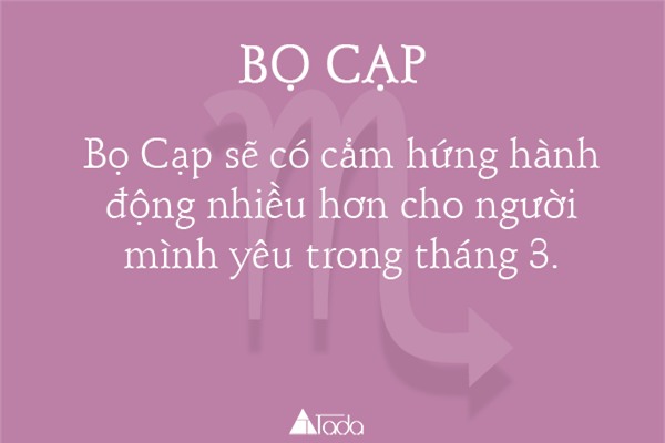 Sôi nổi, bay bổng trong chuyện tình cảm chưa lúc nào là hình ảnh Bọ Cạp lựa chọn cho mình với tình yêu. Tuy nhiên, tháng 3 này, có thể các Bọ Cạp sẽ phá điều lệ đó. Chí ít, bạn sẽ thấy các Bọ Cạp bắt đầu có cảm hứng hành động nhiều hơn và làm nhiều điều hơn cho người mình yêu trong tháng 3. Cùng chờ xem!