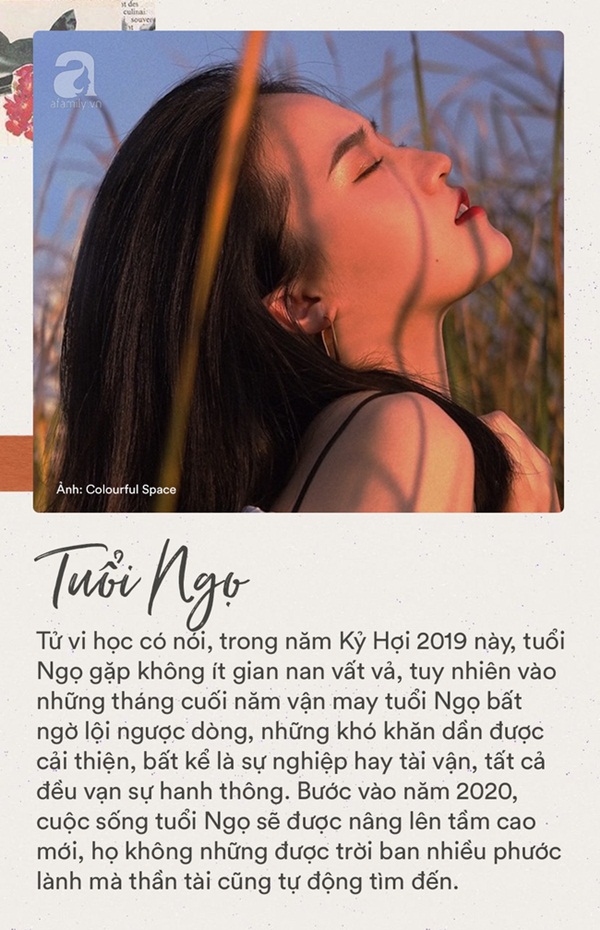 Tử vi học có nói, trong năm Kỷ Hợi 2019 này, tuổi Ngọ gặp không ít gian nan vất vả, tuy nhiên vào những tháng cuối năm vận may tuổi Ngọ bất ngờ lội ngược dòng, những khó khăn dần được cải thiện, bất kể là sự nghiệp hay tài vận, tất cả đều vạn sự hanh thông. Bước vào năm 2020, cuộc sống tuổi Ngọ sẽ được nâng lên tầm cao mới, họ không những được trời ban nhiều phước lành mà thần tài cũng tự động tìm đến. Giữa năm 2020, sự nghiệp của tuổi Ngọ thăng tiến vượt bậc, bắt được cơ hội hiếm có này, tuổi Ngọ thừa thắng xông lên xây dựng mọi thứ viên mãn sung túc. Trong vòng 10 năm tới, tuổi Ngọ sẽ làm được những điều mình muốn làm, không phiền não sầu muộn.