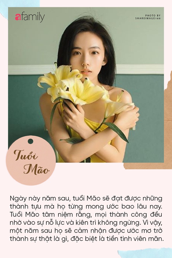 Những người tuổi Mão vốn có tính cách thông minh, nhanh nhẹn và sống tình cảm. Người tuổi Mão tuy không quá tham vọng nhưng họ biết tự mình thay đổi bản thân, tự mình cải thiện những nhược điểm để xây dựng một cuộc sống viên mãn đủ đầy. Thời gian qua, những người tuổi Mão đã phải đối mặt với không ít khó khăn, sóng gió, nhưng nhờ sự bản lĩnh và sự linh hoạt mà họ đã vượt qua mọi thứ một cách ngoạn mục. Ngày này năm sau, tuổi Mão sẽ đạt được những thành tựu mà họ từng mong ước bao lâu nay. Tuổi Mão tâm niệm rằng, mọi thành công đều nhờ vào sự nỗ lực và kiên trì không ngừng. Vì vậy, một năm sau họ sẽ cảm nhận được ước mơ trở thành sự thật là gì, đặc biệt là tiền tình viên mãn.