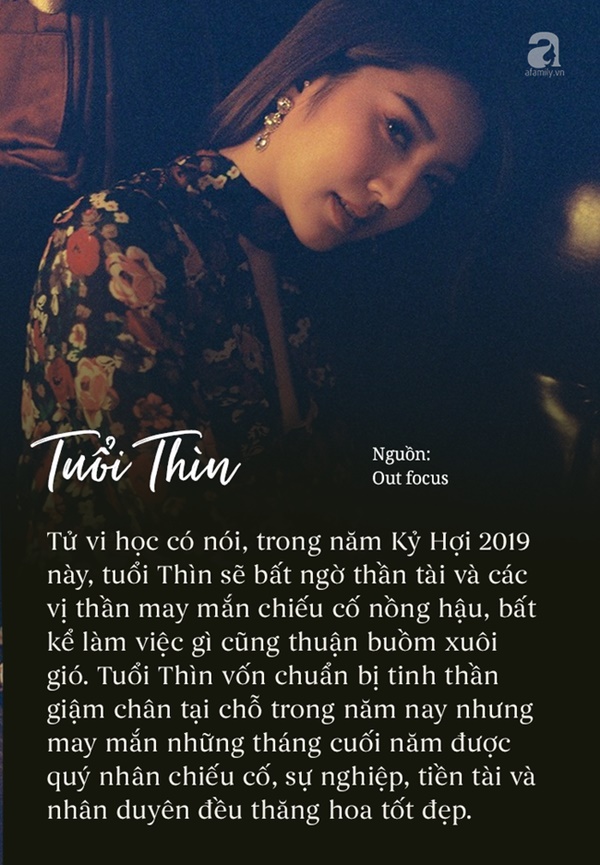 Tử vi học có nói, trong năm Kỷ Hợi 2019 này, tuổi Thìn sẽ bất ngờ thần tài và các vị thần may mắn chiếu cố nồng hậu, bất kể làm việc gì cũng thuận buồm xuôi gió. Tuổi Thìn vốn chuẩn bị tinh thần giậm chân tại chỗ trong năm nay nhưng may mắn những tháng cuối năm được quý nhân chiếu cố, sự nghiệp, tiền tài và nhân duyên đều thăng hoa tốt đẹp. Trước khi bước sang năm mới, tuổi Thìn sẽ gầy dựng mọi thứ thật vững chắc khiến ai cũng ngưỡng mộ.