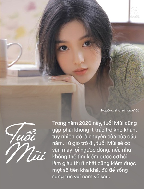 Trong năm 2020 này, tuổi Mùi cũng gặp phải không ít trắc trở khó khăn, tuy nhiên đó là chuyện của nửa đầu năm. Từ giờ trở đi, tuổi Mùi sẽ có vận may lội ngược dòng, nếu như không thể tìm kiếm được cơ hội làm giàu thì ít nhất cũng kiếm được một số tiền kha khá, đủ để sống sung túc vài năm về sau. Đặc biệt, những tháng cuối năm tới đây, tuổi Mùi sẽ gặp được quý nhân, công việc sẽ có tiến triển bất ngờ, có khả năng được thăng chức tăng lương, may mắn hơn sẽ tìm được cơ hội để đổi đời, những ngày tháng về sau không lo tiền bạc, chỉ cần tận hưởng cuộc sống đủ đầy ấm no.