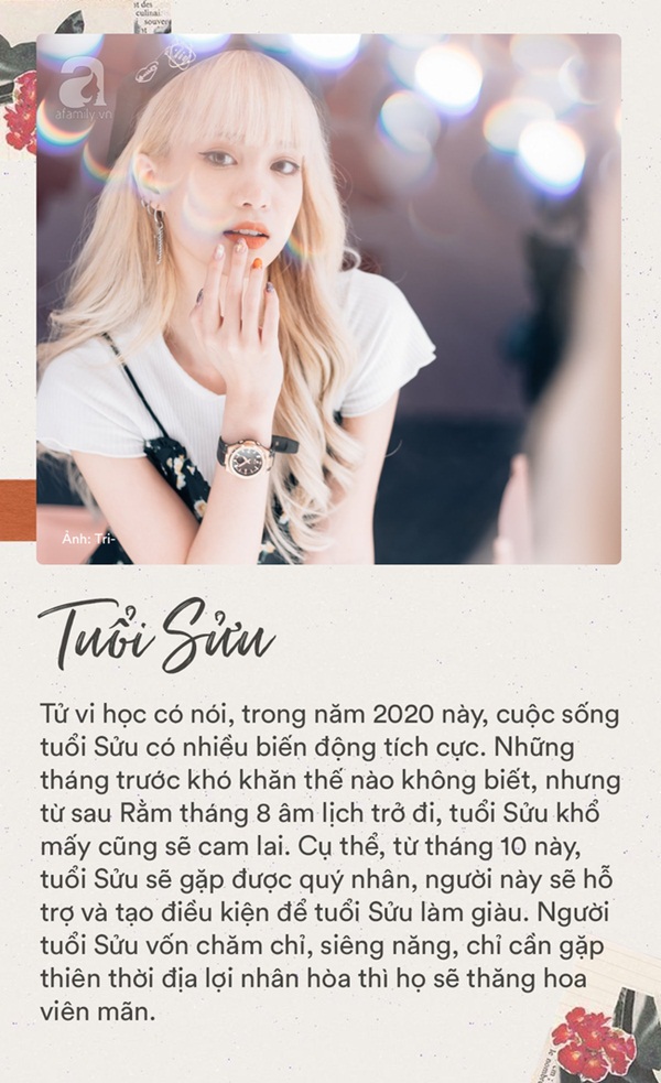 Tử vi học có nói, trong năm 2020 này, cuộc sống tuổi Sửu có nhiều biến động tích cực. Những tháng trước khó khăn thế nào không biết, nhưng từ sau Rằm tháng 8 âm lịch trở đi, tuổi Sửu khổ mấy cũng sẽ cam lai. Cụ thể, từ tháng 10 này, tuổi Sửu sẽ gặp được quý nhân, người này sẽ hỗ trợ và tạo điều kiện để tuổi Sửu làm giàu. Người tuổi Sửu vốn chăm chỉ, siêng năng, chỉ cần gặp thiên thời địa lợi nhân hòa thì họ sẽ thăng hoa viên mãn.