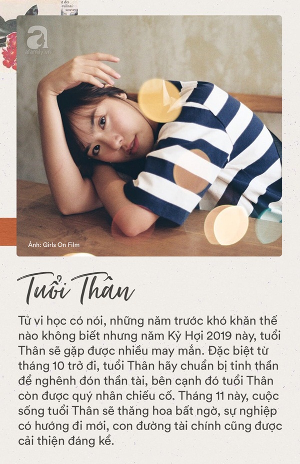 Tử vi học có nói, những năm trước khó khăn thế nào không biết nhưng năm Kỷ Hợi 2019 này, tuổi Thân sẽ gặp được nhiều may mắn. Đặc biệt từ tháng 10 trở đi, tuổi Thân hãy chuẩn bị tinh thần để nghênh đón thần tài, bên cạnh đó tuổi Thân còn được quý nhân chiếu cố. Tháng 11 này, cuộc sống tuổi Thân sẽ thăng hoa bất ngờ, sự nghiệp có hướng đi mới, con đường tài chính cũng được cải thiện đáng kể. Trước khi bước qua năm mới, tuổi Thân ít nhất sẽ được tận hưởng vẹn toàn cả tình lẫn tiền.