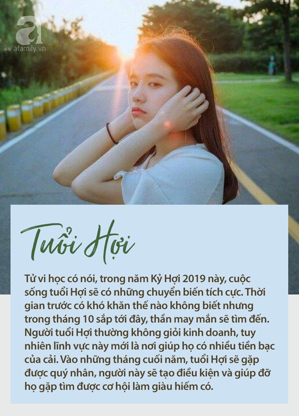 Tử vi học có nói, trong năm Kỷ Hợi 2019 này, cuộc sống tuổi Hợi sẽ có những chuyển biến tích cực. Thời gian trước có khó khăn thế nào không biết nhưng trong tháng 10 sắp tới đây, thần may mắn sẽ tìm đến. Người tuổi Hợi thường không giỏi kinh doanh, tuy nhiên lĩnh vực này mới là nơi giúp họ có nhiều tiền bạc của cải. Vào những tháng cuối năm, tuổi Hợi sẽ gặp được quý nhân, người này sẽ tạo điều kiện và giúp đỡ họ gặp tìm được cơ hội làm giàu hiếm có, nếu như biết nắm bắt thì nửa đời sau chỉ việc an nhàn tận hưởng cuộc sống viên mãn thập toàn.