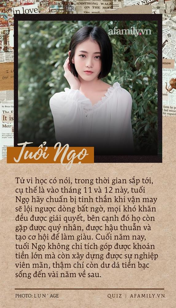 Tử vi học có nói, trong thời gian sắp tới, cụ thể là vào tháng 11 và 12 này, tuổi Ngọ hãy chuẩn bị tinh thần khi vận may sẽ lội ngược dòng bất ngờ, mọi khó khăn đều được giải quyết, bên cạnh đó họ còn gặp được quý nhân, được hậu thuẫn và tạo cơ hội để làm giàu. Cuối năm nay, tuổi Ngọ không chỉ tích góp được khoản tiền lớn mà còn xây dựng được sự nghiệp viên mãn, thậm chí còn dư dả tiền bạc sống đến vài năm về sau.