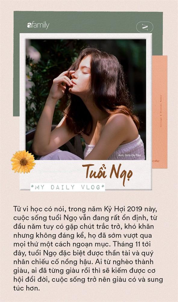 Tử vi học có nói, trong năm Kỷ Hợi 2019 này, cuộc sống tuổi Ngọ vẫn đang rất ổn định, từ đầu năm tuy có gặp chút trắc trở, khó khăn nhưng không đáng kể, họ đã sớm vượt qua mọi thứ một cách ngoạn mục. Tháng 11 tới đây, tuổi Ngọ đặc biệt được thần tài và quý nhân chiếu cố nồng hậu. Ai từ nghèo thành giàu, ai đã từng giàu rồi thì sẽ kiếm được cơ hội đổi đời, cuộc sống trở nên giàu có và sung túc hơn. Trước khi bước qua năm 2020, tuổi Ngọ sẽ cảm nhận được vận may đang thay đổi từng ngày, giúp công việc, tài vận và mọi thứ trở nên suôn sẻ, thuận lợi hơn.