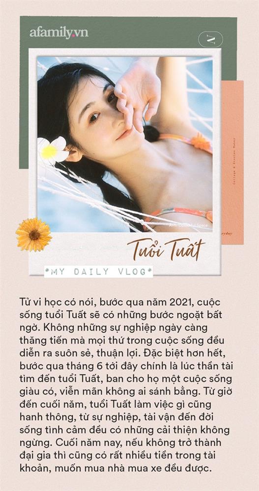Tử vi học có nói, bước qua năm 2021, cuộc sống tuổi Tuất sẽ có những bước ngoặt bất ngờ. Không những sự nghiệp ngày càng thăng tiến mà mọi thứ trong cuộc sống đều diễn ra suôn sẻ, thuận lợi. Đặc biệt hơn hết, bước qua tháng 6 tới đây chính là lúc thần tài tìm đến tuổi Tuất, ban cho họ một cuộc sống giàu có, viễn mãn không ai sánh bằng. Từ giờ đến cuối năm, tuổi Tuất làm việc gì cũng hanh thông, từ sự nghiệp, tài vận đến đời sống tình cảm đều có những cải thiện không ngừng. Cuối năm nay, nếu không trở thành đại gia thì cũng có rất nhiều tiền trong tài khoản, muốn mua nhà mua xe đều được.