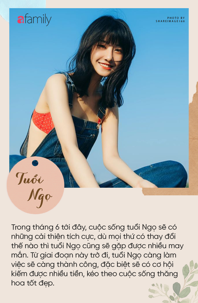 Những người tuổi Ngọ có tính cách thoải mái, thích tự do tự tại và luôn muốn độc lập sáng tạo, không muốn phụ thuộc vào bất cứ ai. Đa số những người tuổi Ngọ đều gặt hái được nhiều thành công vào giai đoạn tiền vận. Tuy nhiên, trong cuộc sống có những điều xảy ra không như ý muốn và tuổi Ngọ cũng phải đối mặt với nhiều khó khăn trăn trở. Trong tháng 6 tới đây, cuộc sống tuổi Ngọ sẽ có những cải thiện tích cực, dù mọi thứ có thay đổi thế nào thì tuổi Ngọ cũng sẽ gặp được nhiều may mắn. Từ giai đoạn này trở đi, tuổi Ngọ càng làm việc sẽ càng thành công, đặc biệt sẽ có cơ hội kiếm được nhiều tiền, kéo theo cuộc sống thăng hoa tốt đẹp. Cuối năm nay, tuổi Ngọ chuẩn bị đón nhận nhiều hỷ sự, giúp đời sống tinh thần thoải mái dễ chịu.