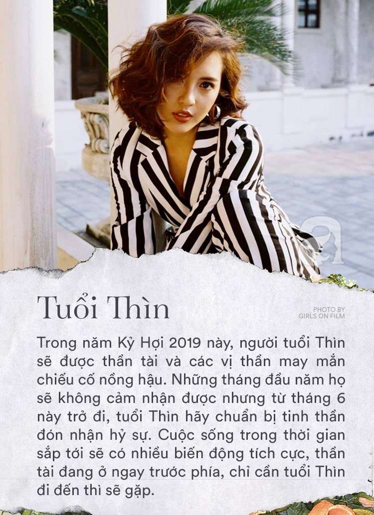 Trời sinh tuổi Thìn là những người mang số mệnh của Rồng, luôn có trách nhiệm với cuộc sống của mình và không ngừng theo đuổi ước mơ giàu có lẫn quyền lực. Đa số người tuổi Thìn thường gặt hái được nhiều thành công khi còn trẻ. Dù lên đến đỉnh vinh quang nhưng họ không ngừng nỗ lực, cố gắng để giữ vững vị trí đó. Tuy nhiên, cũng có lúc vận may thay đổi, tuổi Thìn cũng như bao con giáp khác, cũng phải đối mặt với nhiều khó khăn, thử thách. Trong năm Kỷ Hợi 2019 này, người tuổi Thìn sẽ được thần tài và các vị thần may mắn chiếu cố nồng hậu. Những tháng đầu năm họ sẽ không cảm nhận được nhưng từ tháng 6 này trở đi, tuổi Thìn hãy chuẩn bị tinh thần đón nhận hỷ sự. Cuộc sống trong thời gian sắp tới sẽ có nhiều biến động tích cực, thần tài đang ở ngay trước phía, chỉ cần tuổi Thìn đi đến thì sẽ gặp. Dự kiến, những tháng cuối năm, sự nghiệp tuổi Thìn không những thăng tiến vượt bậc mà còn mở ra nhiều cơ hội tốt để đổi đời, có khả năng năm sau trở thành đại gia quyền lực.