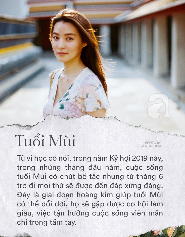 Trời sinh những người tuổi Mùi có tính cách hiền lành, chăm chỉ, không tham vọng nhưng luôn biết nỗ lực hết mình để có được một cuộc sống đầy đủ, sung túc. Người tuổi Mùi tâm niệm rằng, cuộc đời sướng khổ là do mình, họ không phải là người ngồi chờ vận may mà luôn biết cố gắng để đạt được điều mình mong muốn. Nhờ tính cách này mà tuổi Mùi được trời ban nhiều phúc đức, họ khó khăn thế nào cũng sẽ có quý nhân giúp đỡ. Tử vi học có nói, trong năm Kỷ hợi 2019 này, trong những tháng đầu năm, cuộc sống tuổi Mùi có chút bế tắc nhưng từ tháng 6 trở đi mọi thứ sẽ được đền đáp xứng đáng. Đây là giai đoạn hoàng kim giúp tuổi Mùi có thể đổi đời, họ sẽ gặp được cơ hội làm giàu, việc tận hưởng cuộc sống viên mãn chỉ trong tầm tay. Nhìn chung, năm nay sẽ là năm tam hợp của tuổi Mùi, vì vậy bất kể làm việc gì cũng sẽ gặt hái được thành công, không nhiều thì ít, cuối năm viên mãn đủ đầy cả tiền lẫn tình.