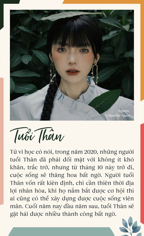 Tử vi học có nói, trong năm 2020, những người tuổi Thân đã phải đối mặt với không ít khó khăn, trắc trở, nhưng từ tháng 10 này trở đi, cuộc sống sẽ thăng hoa bất ngờ. Người tuổi Thân vốn rất kiên định, chỉ cần thiên thời địa lợi nhân hòa, khi họ nắm bắt được cơ hội thì ai cũng có thể xây dựng được cuộc sống viên mãn. Cuối năm nay đầu năm sau, tuổi Thân sẽ gặt hái được nhiều thành công bất ngờ. Đặc biệt đối với những người làm ăn kinh doanh, thì từ giai đoạn này trở đi sẽ tìm được cơ hội phát triển tuyệt vời.