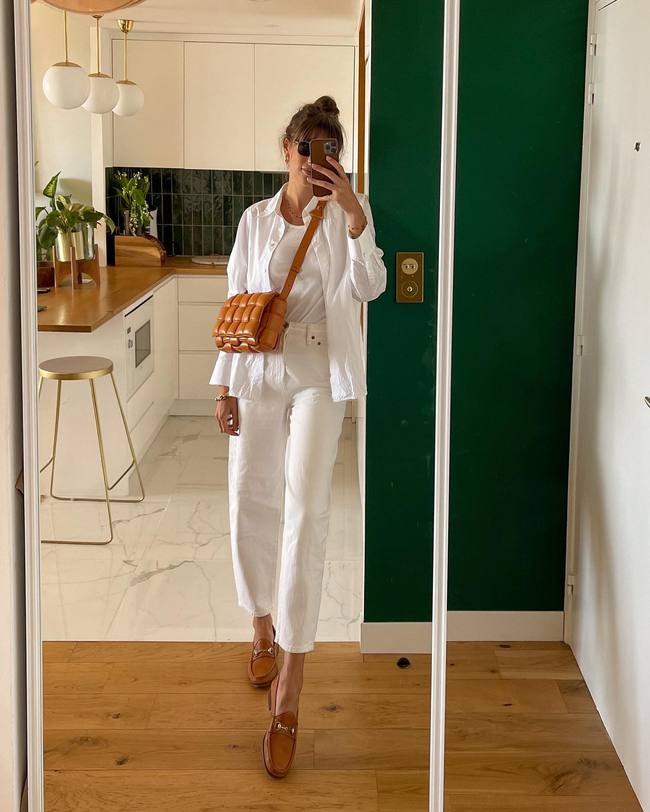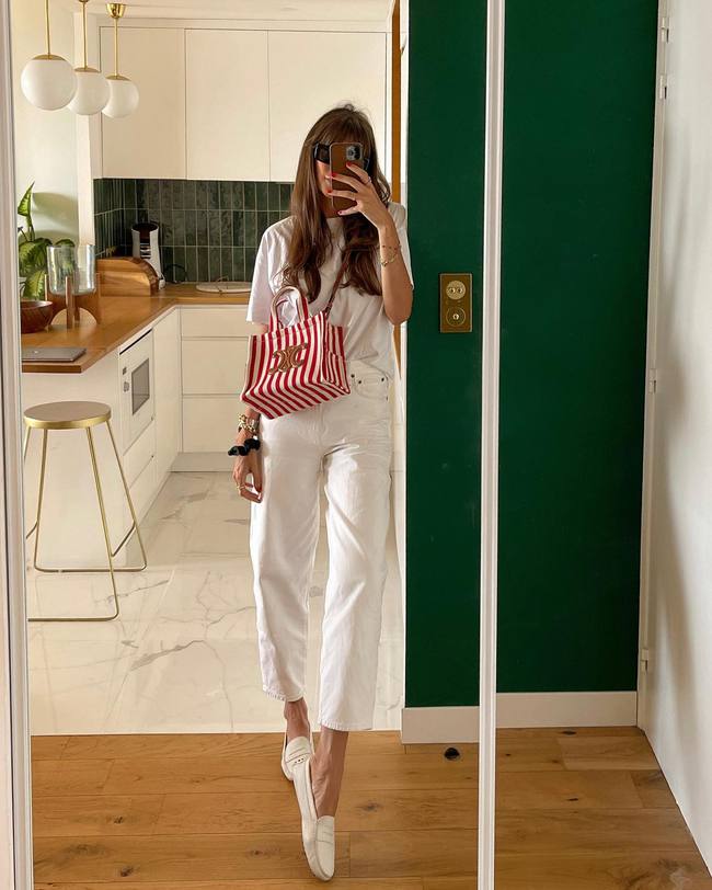 Những lúc không biết mặc gì, chị em chỉ đơn giản là kết hợp áo thun trắng với quần jeans ống đứng, đi loafer xuyệt tông như lựa chọn của Julie Sergent Ferreri, vậy là sành điệu khỏi nghĩ. Muốn tạo điểm nhấn nổi bật cho outfit, chị em hãy diện một chiếc túi xách màu rực rỡ, đảm bảo đẹp mắt và chẳng sợ bị lệch pha.