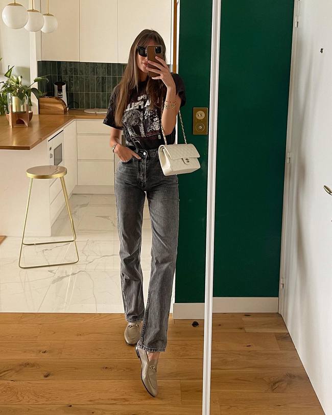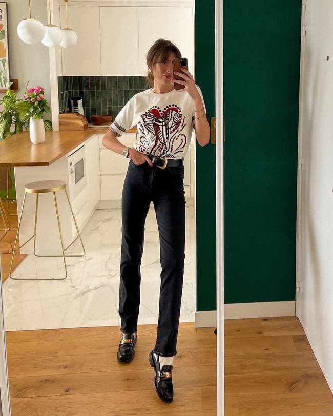 Nhờ mix quần jeans đen với áo thun họa tiết, Julie Sergent Ferreri có được set trang phục đầy cá tính, nổi bật. Quần jeans đen ống đứng là một item đáng để chị em bổ sung cho tủ đồ. Kiểu quần này dễ mặc, dễ đẹp, vẫn mang đến cho người diện sự trẻ trung, nhưng đồng thời còn ghi trọn điểm thanh lịch.