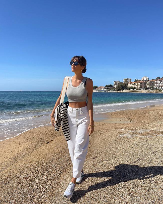 Quần jeans cũng có thể diện đi biển, nếu chị em mix đồ theo hướng khỏe khoắn như Julie Sergent Ferreri. Quý cô người Pháp đã mix mẫu quần jeans ống đứng với áo crop top ôm sát, tôn dáng chuẩn, rồi kết lại bằng đôi sneaker không thể hợp hơn.