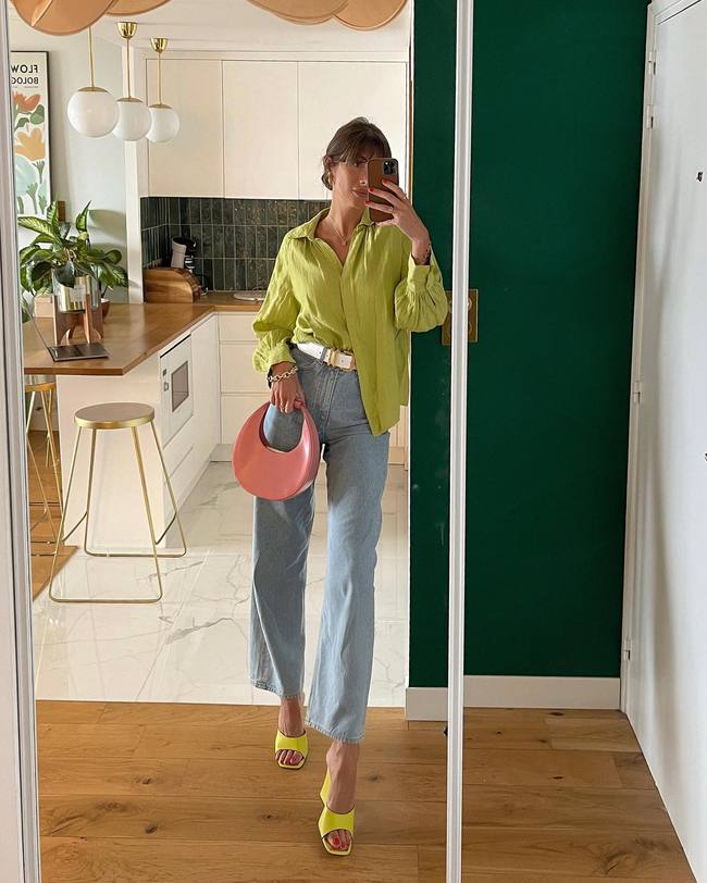 Màu xanh bơ rất lý tưởng để diện trong mùa hè vì trông trẻ trung, tươi mát. Julie Sergent Ferreri gợi ý cho chị em cách diện áo sơ mi xanh bơ không hề lòe loẹt, đó là kết hợp cùng quần jeans xanh, sơ vin gọn gàng, rồi đi mule xuyệt tông. Ngoài sự nổi bật, tổng thể trang phục trên còn rất long lanh, chanh sả.