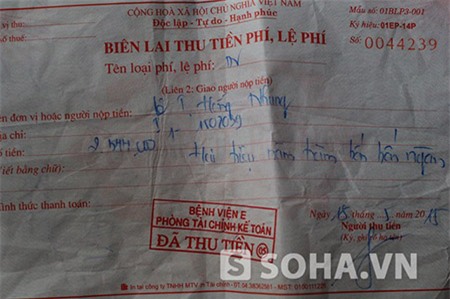 Sau đó, chị Nhung được đưa vào khoa Cấp cứu - Bệnh viện E trung ương (đường Trần Cung, Hà Nội), đồng thời, đóng khoản tiền tạm ứng là 3 triệu đồng.