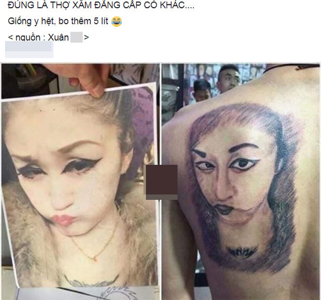 "Xăm hình bạn gái trên lưng để thể hiện tình yêu nhưng không khéo anh chàng này bị 'đá' ấy chứ. Cô gái xinh xắn thế kia mà bỗng nhiên trở thành phù thủy rồi đấy", tài khoản Nguyễn Hoàng hài hước.