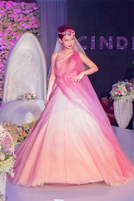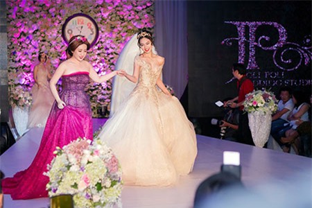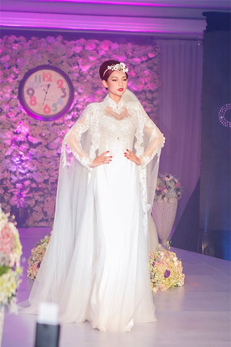 | Sau thời gian chụp ảnh tại sảnh tiệc, nữ MC diện lại bộ đầm voan trắng, bước lên sàn diễn với vai trò người mẫu. Dù không có nhiều kinh nghiệm catwalk, cô vẫn thể hiện tự tin và chuyên nghiệp không kém cạnh dàn mẫu của chương trình. |
