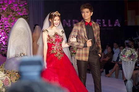 Cặp đôi Trương Quỳnh Anh - Tim cũng tham gia show diễn. Nam ca sĩ nhẹ nhàng dìu bà xã catwalk. |