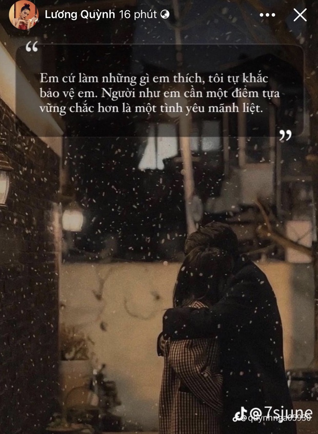 Trước đó, diễn viên Quỳnh Lương đăng những dòng chia sẻ đầy tâm trạng về chuyện tình cảm: "Anh nghĩ em không đủ sức để cưng chiều bản thân mình sao? Thế giới này làm em tổn thương bao nhiêu, em tự bù đắp xong hết rồi" hay "Em cứ làm những gì em thích, tôi tự khắc bảo vệ em. Người như em cần một điểm tựa vững chắc hơn là một tình yêu mãnh liệt". Tuy nhiên, khi được netizen thắc mắc, nữ diễn viên sau đó đã lên tiếng đính chính: "Không có gì buồn cả đâu ạ. Xưa giờ tôi vẫn chia sẻ bài đăng vậy mà". Về phía "thiếu gia Trà Vinh", anh cũng chia sẻ story đầy tâm trạng với nền nhạc Cảm ơn của Đen Vâu.