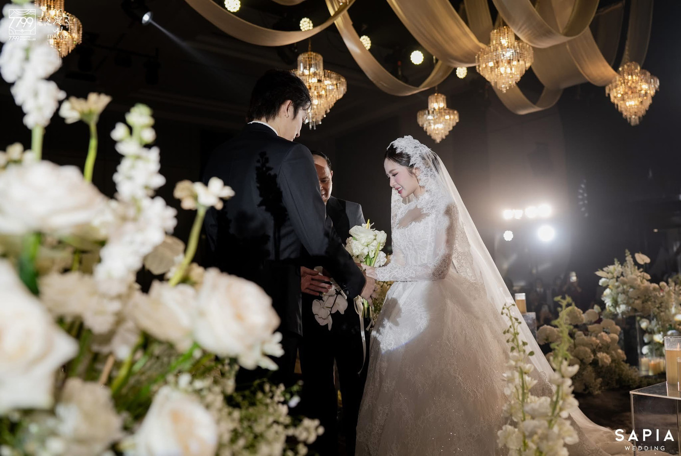 Tại tiệc cưới chính thức, Ngọc Huyền chọn chiếc váy cưới kín đáo, cô xuất hiện xinh như công chúa giữa không gian ngập tràn hoa tươi. Trong khi đó, chú rể diện vest bảnh bao, không ngừng quan tâm và trao cho cô dâu những cử chỉ ngọt ngào.