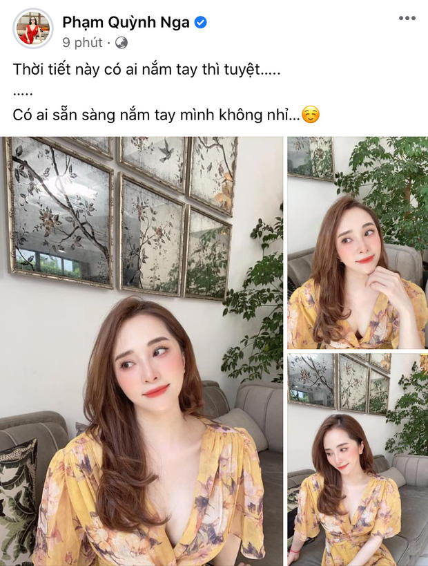 Chuyện là trên trang cá nhân ngày 17/10, Quỳnh Nga diện váy hở hiểm hóc, để lộ khe ngực sexy kèm đôi ba câu thính: "Thời tiết này có ai nắm tay thì tuyệt. Vậy có ai sẵn sàng nắm tay mình không nhỉ?" Là nhân vật được netizen tác hợp với Quỳnh Nga nên Việt Anh cũng nhanh chóng có mặt. Ngay dưới phần bình luận, nam diễn viên đưa ra một lời đề nghị hài hước khiến netizen đồng loạt thả "haha", anh viết: "Có nắm chân không, cho anh gửi cái chân nắm hộ, trời hơi lạnh".