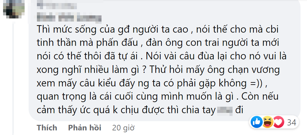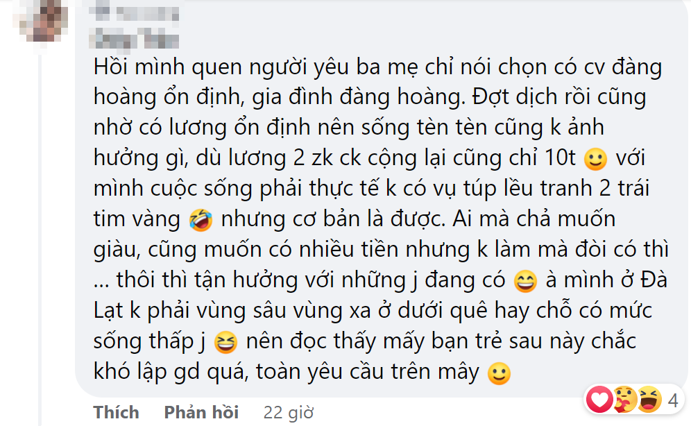 Xong về. Theo mọi người nếu mẹ người yêu kiểu không thích mình, nói mình như vậy thì có nên tiếp tục không? Kể cả nói ra sự thật là gia đình mình, bản thân mình, tài sản, nhưng mình không thích cách mà người ta khinh người lương thấp. Ai chẳng có lúc này lúc kia, bây giờ khó khăn, sau này giàu có, hoặc bây giờ có thể giàu có, sau này lại nghèo khó, quan trọng là có thật sự yêu nhau không! Mình cũng muốn tìm 1 người yêu mình, gia đình hiểu mình, chứ không phải lương là thước đo của lòng người!”