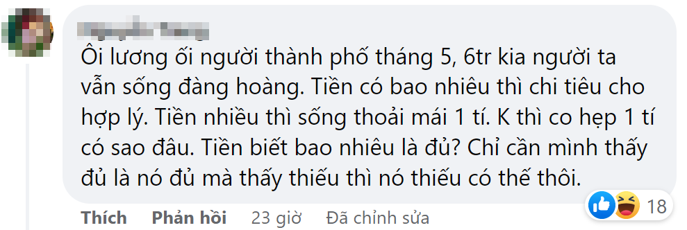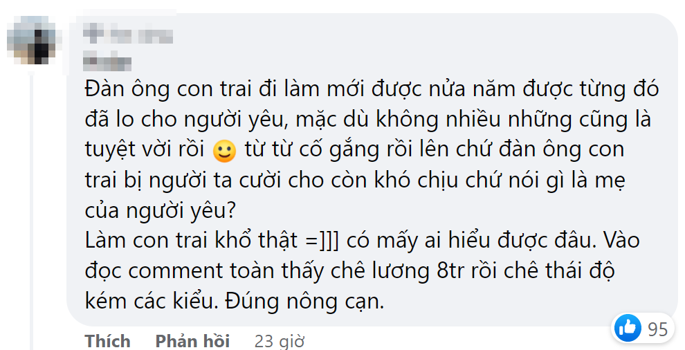 “Nhiều người lớn tư tưởng cũng lạ thật, mình và người yêu yêu nhau được 2 năm. Cho mình xin giấu chỗ làm, đại loại lương theo hệ số hiện tại hơn 8 triệu, thi thoảng có chút màu mè cảm ơn thì được hơn 10 nhưng lương vẫn là hơn 8 triệu. Lương vậy nhưng mình không bao giờ để người yêu thiệt, đổi điện thoại mới, nhà cửa, xe cộ mình đủ cả và nói thật vị trí của mình để mà nói thì có tiền có khi cũng chẳng vào được, ít nhất là bằng thạc sĩ, năng lực phải có… Mình cũng chỉ mới vào đây được nửa năm, cũng là tiền đề để bước tiến sau này.
