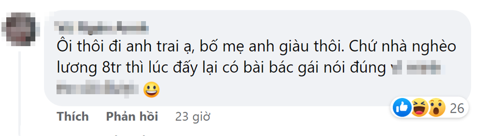 Dưới bài đăng của chàng trai, cư dân mạng thể hiện 2 ý kiến trái chiều. Một là chê trách mẹ bạn gái, cho rằng với mức lương như vậy cũng đã là ổn, “khéo ăn thì no, khéo co thì ấm”, cũng không nên ngay lần gặp đầu tiên đã hỏi chuyện nhạy cảm như lương lậu. Hai là cho rằng người mẹ có lý khi đặt thẳng vấn đề lương, bởi ai cũng mong gửi gắm con gái mình cho người đàn ông có thực lực kinh tế, như vậy sẽ bớt khổ. Hơn nữa, tuy chàng trai gia đình có điều kiện thật nhưng đó vẫn là tiền của của bố mẹ anh ta, còn mức lương 8 triệu của anh ta là thực tế.