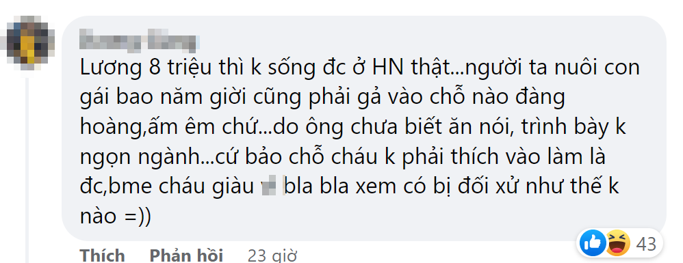 - Giờ sinh viên ra trường cái nó đã lương 10 – 15 triệu rồi, cháu thạc sĩ làm trong đấy lương có 8 triệu cũng đủ sống ở Hà Nội à? Lương 8 triệu thì nuôi ai hả cháu?