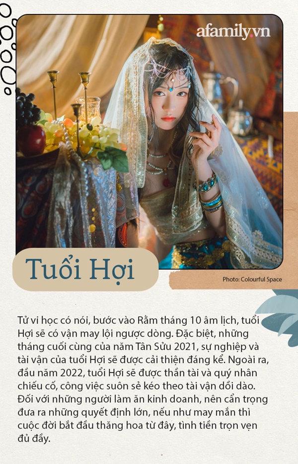Tử vi học có nói, bước vào Rằm tháng 10 âm lịch, tuổi Hợi sẽ có vận may lội ngược dòng. Đặc biệt, những tháng cuối cùng của năm Tân Sửu 2021, sự nghiệp và tài vận của tuổi Hợi sẽ được cải thiện đáng kể. Ngoài ra, đầu năm 2022, tuổi Hợi sẽ được thần tài và quý nhân chiếu cố, công việc suôn sẻ kéo theo tài vận dồi dào. Đối với những người làm ăn kinh doanh, nên cẩn trọng đưa ra những quyết định lớn, nếu như may mắn thì cuộc đời bắt đầu thăng hoa từ đây, tình tiền trọn vẹn đủ đầy.