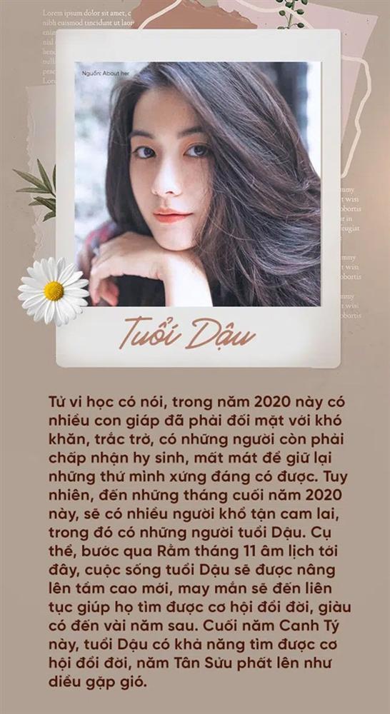 Tử vi học có nói, trong năm 2020 này có nhiều con giáp đã phải đối mặt với khó khăn, trắc trở, có những người còn phải chấp nhận hy sinh, mất mát để giữ lại những thứ mình xứng đáng có được. Tuy nhiên, đến những tháng cuối năm 2020 này, sẽ có nhiều người khổ tận cam lai, trong đó có những người tuổi Dậu. Cụ thể, bước qua Rằm tháng 11 âm lịch tới đây, cuộc sống tuổi Dậu sẽ được nâng lên tầm cao mới, may mắn sẽ đến liên tục giúp họ tìm được cơ hội đổi đời, giàu có đến vài năm sau. Cuối năm Canh Tý này, tuổi Dậu có khả năng tìm được cơ hội đổi đời, năm Tân Sửu phất lên như diều gặp gió.