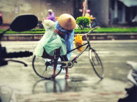 Bức ảnh người mẹ che áo mưa cho con trên chiếc xe đạp khiến nhiều người lớn không kìm được lòng khi nhớ về những tháng ngày xưa cũ.