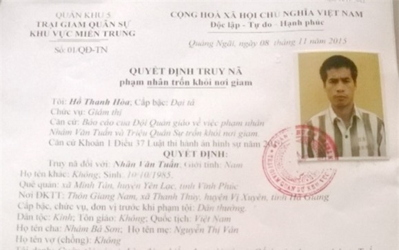 Khoảng 1h ngày 8/11/2015, lợi dụng sơ hở của cán bộ trông coi, 2 tù nhân Tuấn, Sự đã cưa song sắt phòng giam và vượt ngục. Ngay sau đó, Trạm giam Quân sự phát lệnh truy nã trên toàn quốc đối với 2 đối tượng này.