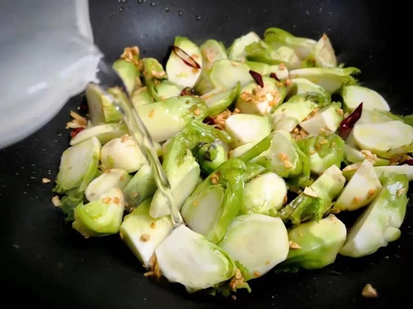 Bước 3: Làm nóng chảo, cho một lượng dầu ăn vừa đủ vào. Tiếp đó bạn thêm tỏi băm rồi phi trên lửa vừa cho đến khi dậy mùi thơm. Kế tiếp bạn cho ớt khô vào xào cho đến khi đổi màu thì thêm rau mầm đá, xào nhanh tay. Đun rau mầm đá trên lửa lớn trong khoảng 2 phút rồi đổ một chút nước vào.
